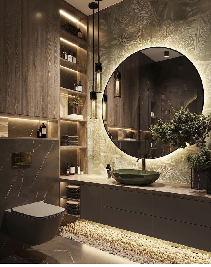 A combinação de um espelho redondo grande com pendentes delicados cria um equilíbrio visual perfeito. O espelho não compete com as luminárias, mas sim trabalha em conjunto para criar um ponto focal atraente.