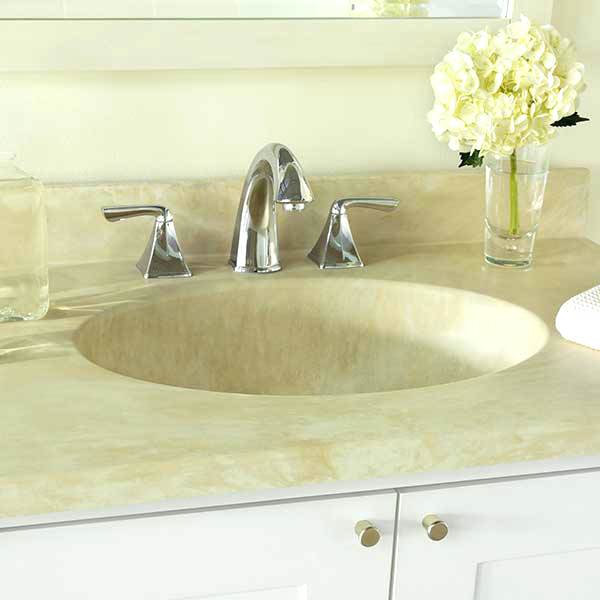 Pias de granito com cuba são opções para banheiros pequenos e lavabos. A cor bege é muito apreciada nessas situações.
