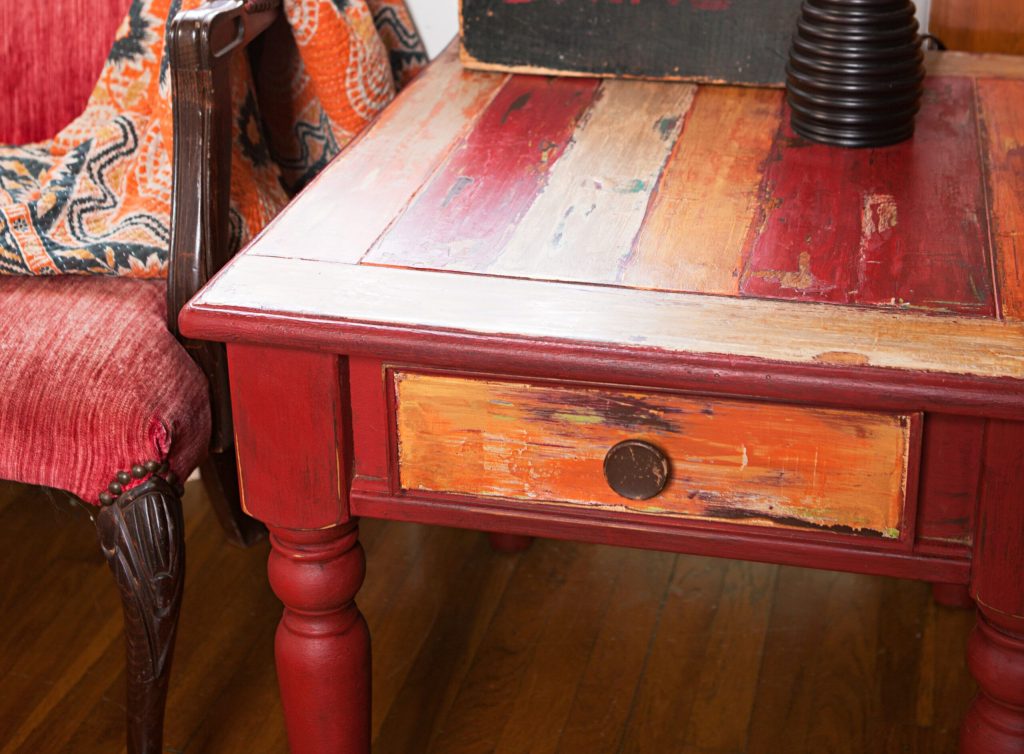 Você aplica uma cor base e em seguida basta lixar levemente as bordas e áreas de maior desgaste para revelar a cor original ou a madeira por baixo.