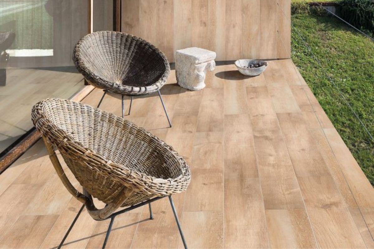 O porcelanato amadeirado, além de oferecer um visual caloroso, é extremamente versátil e continua sendo uma tendência para a varanda em 2024.