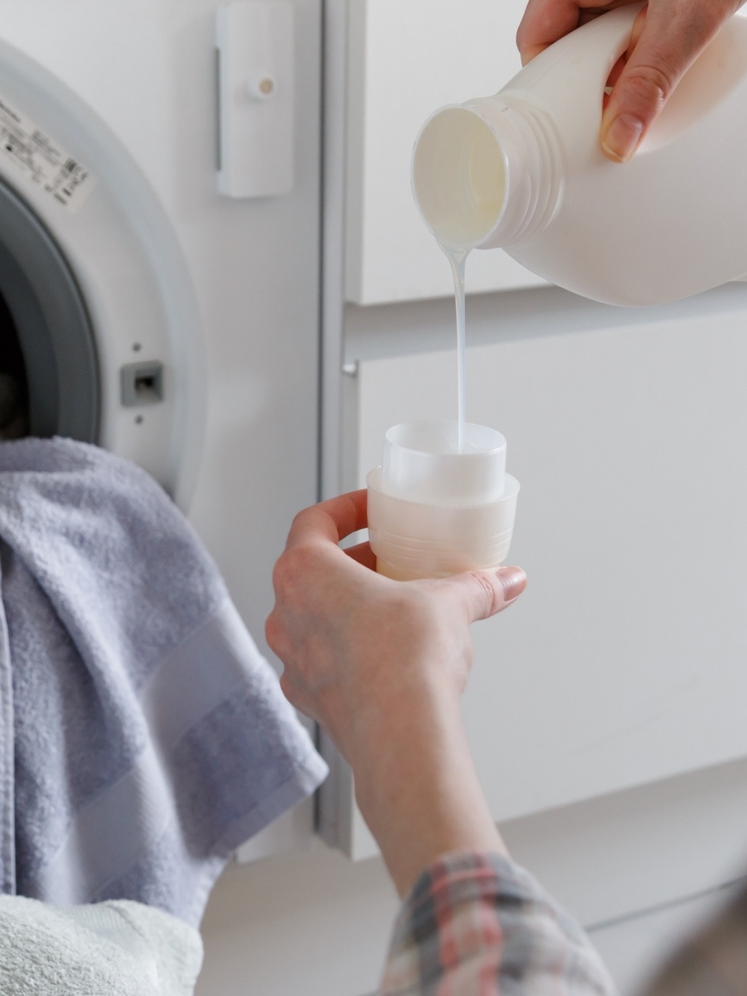 Para usá-lo, basta adicioná-lo no dispenser da máquina de lavar (ou aplicar diretamente na água de um balde ou bacia, se for lavar a roupa à mão).