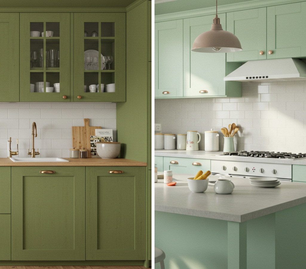 Por fim, entre os tons de verde para cozinha que estão em alta para 2025, o verde pastel se destaca, com a tonalidade “Cool Matcha” ganhando espaço nas tendências.