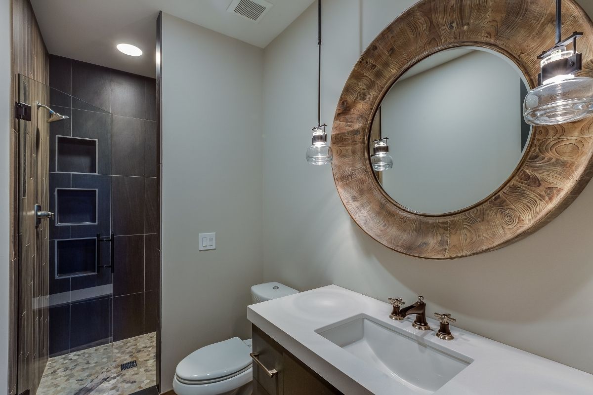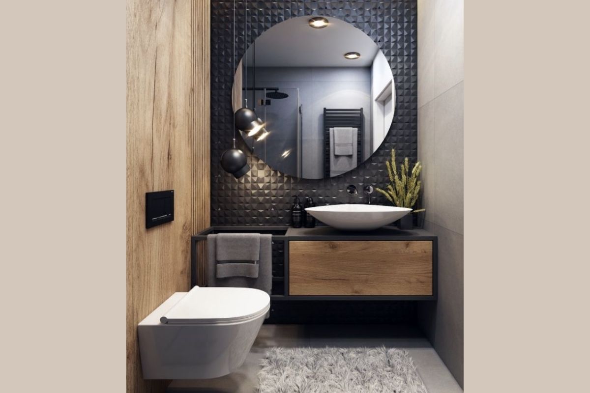 Em um banheiro menor, um espelho redondo de tamanho grande pode criar a ilusão de amplitude, refletindo a luz de maneira a abrir o espaço.