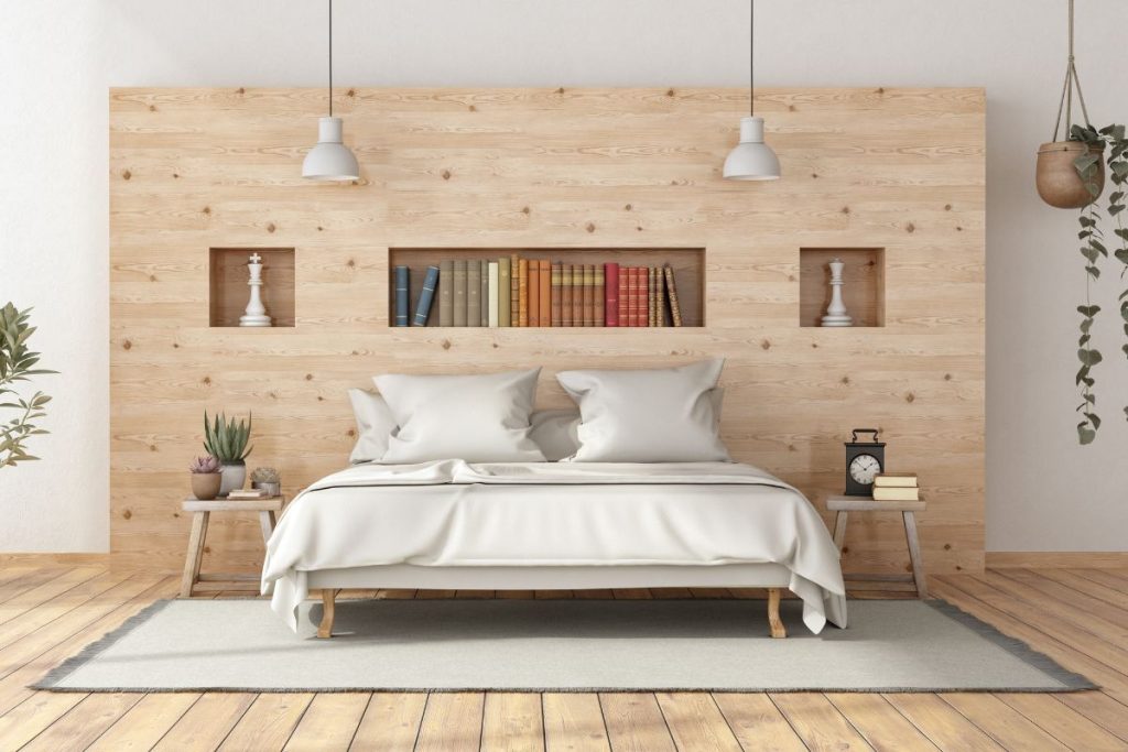 Quartos de casal muitas vezes têm espaços subutilizados que podem ser perfeitos para nichos.