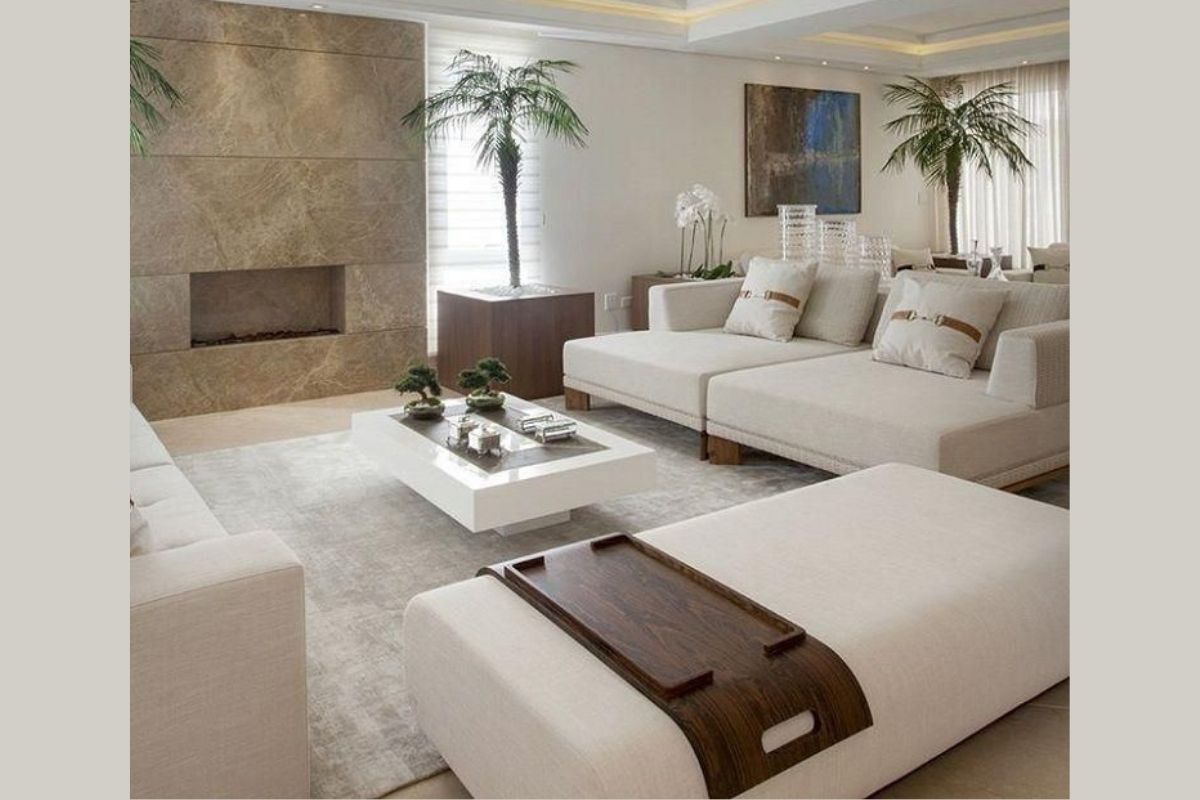 Na composição da sala de estar, o off-white funciona como um contraponto elegante ao branco integral, ganhando vida em meio a acessórios como almofadas vibrantes, tapetes com textura e obras de arte expressivas.