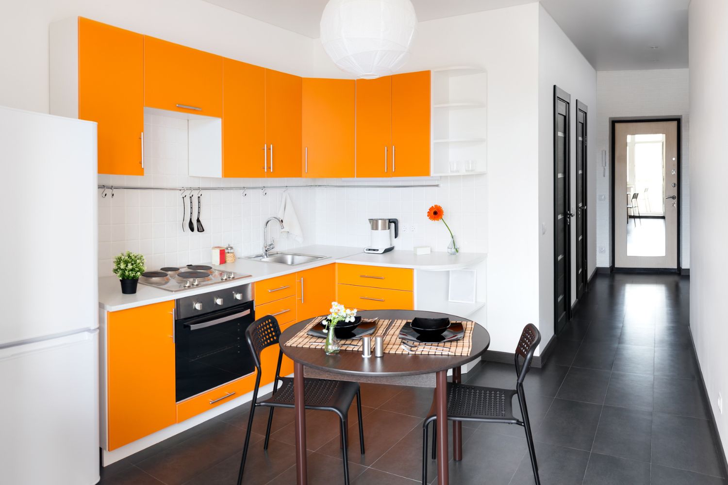 O laranja é uma ótima opção para quem busca uma cozinha cheia de energia e vitalidade. No entanto, assim como o vermelho, é importante equilibrar o uso do laranja com outras cores mais neutras, para evitar um ambiente muito agitado.