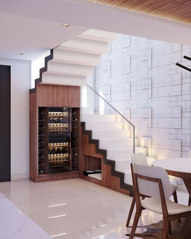 O espaço embaixo da escada em U pode ser aproveitado para a criação de um bar, adega ou até mesmo com pequenos nichos decorativos.