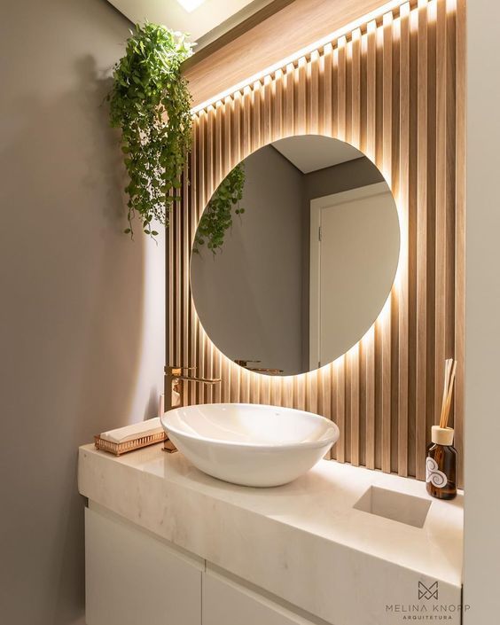 A textura e a cor natural da madeira trazem calor e aconchego ao lavabo. Além disso, entre os modelos de espelho, esse combina muito bem com um lavabo repleto de elementos naturais, como pedra ou cerâmica.