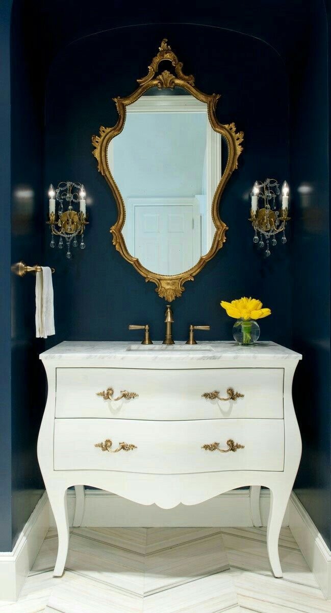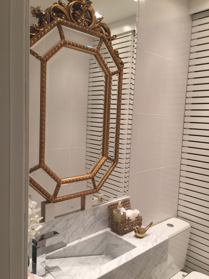 Um espelho Art Déco pode servir como o ponto focal de um lavabo moderno, especialmente quando acompanhado de acessórios metálicos e cores contrastantes.