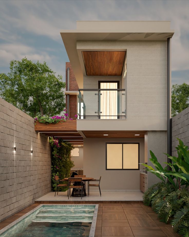 Os telhados em casas modernas geralmente são planos ou têm pouca inclinação, o que se alinha com a estética minimalista.